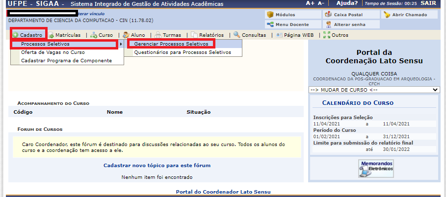 A tela seguinte será exibida: No campo destinado a listagem dos processos seletivos, o Coordenador ou Secretário deverá selecionar o curso em que deseja cadastrar o discente e em seguida clicar no ícone A tela abaixo será exibida: