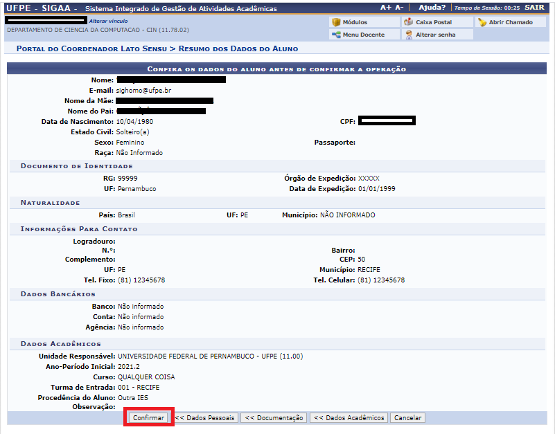 Em seguida clicaremos em “Próximo”, e a seguinte tela de confirmação será exibida: Após a conferência dos dados, clique em “Confirmar”.