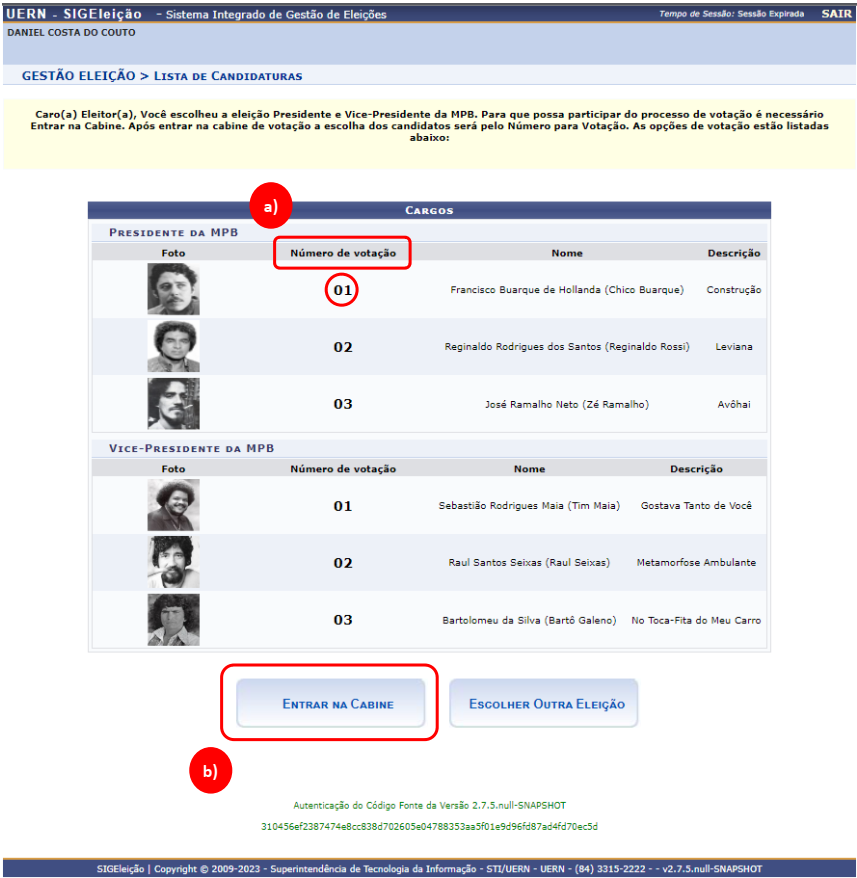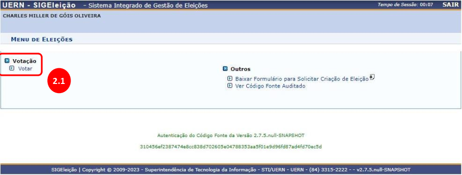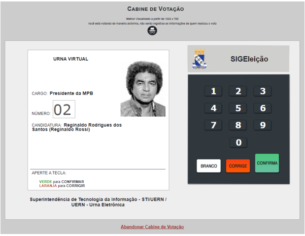 Conteúdo[1] ACESSAR SIGELEIÇÃO: [1.1] Para acessar o sistema de votação utilize o seguinte endereço: sigaa.uern.br/sigeleicao/ O sistema exibirá a tela como é mostrado abaixo: [1.2] Para entrar no sistema é necessário preencher os campos usuário e a senha (os mesmos utilizados para acesso ao SIG-UERN [SIGAA/SIPAC/SIGRH] ). [2] COMO VOTAR: [2.1] Depois de acessar o sistema, será exibida a tela abaixo com o menu de eleições. Para acessar as eleições disponíveis, o eleitor deverá clicar em Votar. [2.2] Depois de acessar o sistema, será exibida a tela abaixo com as eleições disponíveis para o dia. Para escolher a eleição para a qual deseja votar, o eleitor deverá clicar no ícone a) O usuário só poderá votar no(s) dia(s) e horários definidos para a respectiva eleição. b) Somente é permitido ao eleitor acessar a eleição na qual ele esteja associado ao grupo de eleitores. c) Cada usuário poderá votar apenas uma vez em cada eleição. [2.3] Ao escolher a eleição, o sistema exibirá a lista dos CARGOS, com a imagem dos candidatos/chapas, número de votação, nome e descrição. Como mostra a figura abaixo: a) Para eleições com muitos cargos e/ou candidatos é importante que o eleitor se certifique do número de votação do candidato/chapa de sua preferência, pois ele será a única forma de registrar o voto na cabine de votação. b) O eleitor deverá selecionar a opção “Entrar na Cabine” para iniciar a votação. O sistema exibirá a cabine de votação. [2.4] Na cabine de votação, o eleitor deverá digitar o número do candidato/chapa (número de votação) em que deseja votar e o sistema exibirá as informações do candidato/chapa na cabine de votação, como mostra a figura abaixo: a) Em seguida, deverá digitar o número do candidato/chapa e, depois, apertar a tecla (CONFIRMA) para confirmar o voto. b) Deverá apertar a tecla (CORRIGE) para corrigir os números digitados incorretamente. c) Deverá apertar a tecla (BRANCO) caso deseje votar em branco. d) Se for digitado algum número de candidato/chapa INVÁLIDO e o eleitor clicar em CONFIRMAR, o voto será considerado NULO. e) Se o eleitor esquecer o número do candidato/chapa em que for votar é só selecionar a opção “Abandonar Cabine de Votação”. Assim, o sistema retornará à tela com a lista dos candidatos/chapas daquela eleição ele poderá retornar à cabine de votação posteriormente para registrar o seu voto. [2.5] Para confirmar o voto, o eleitor deverá acionar o botão “Confirmar”. Se desejar cancelar o procedimento e voltar para a cabine de votação, o eleitor deverá acionar o botão “Cancelar”. Após acionar o botão “Confirmar” será emitido sinal sonoro de confirmação do voto e, posteriormente, exibirá uma tela com o “Comprovante de Votação”, conforme mostra a figura a seguir: