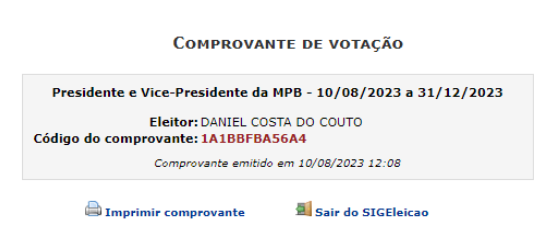 a) Para imprimir o comprovante de votação o eleitor deve selecionar a opção “Imprimir comprovante”. b) Para sair do sistema SIGEleição, o eleitor deverá selecionar a opção “Sair do SIGEleição”. O sistema então retornará para a tela inicial de autenticação. | |||