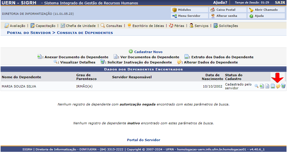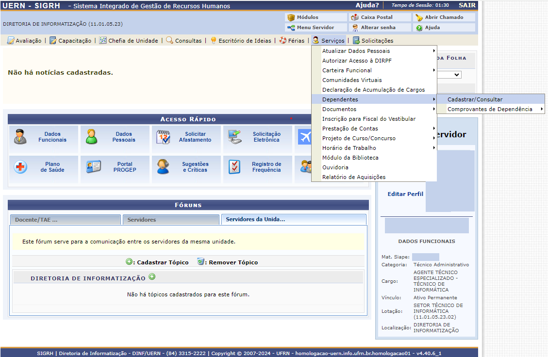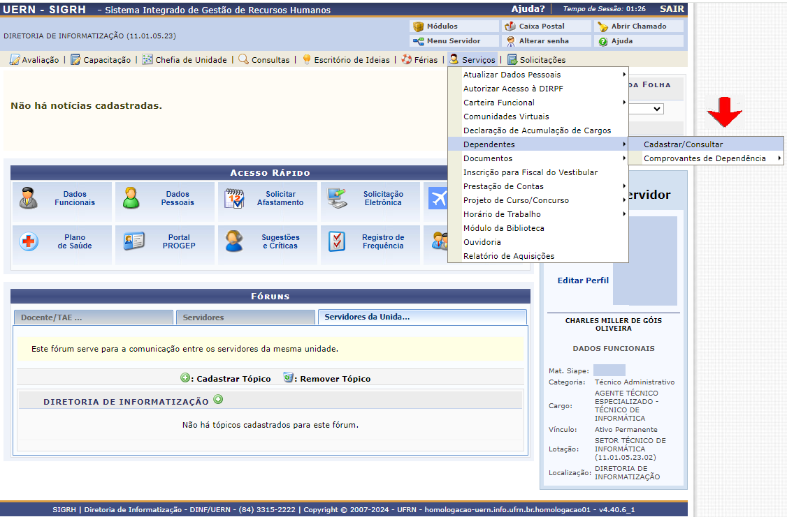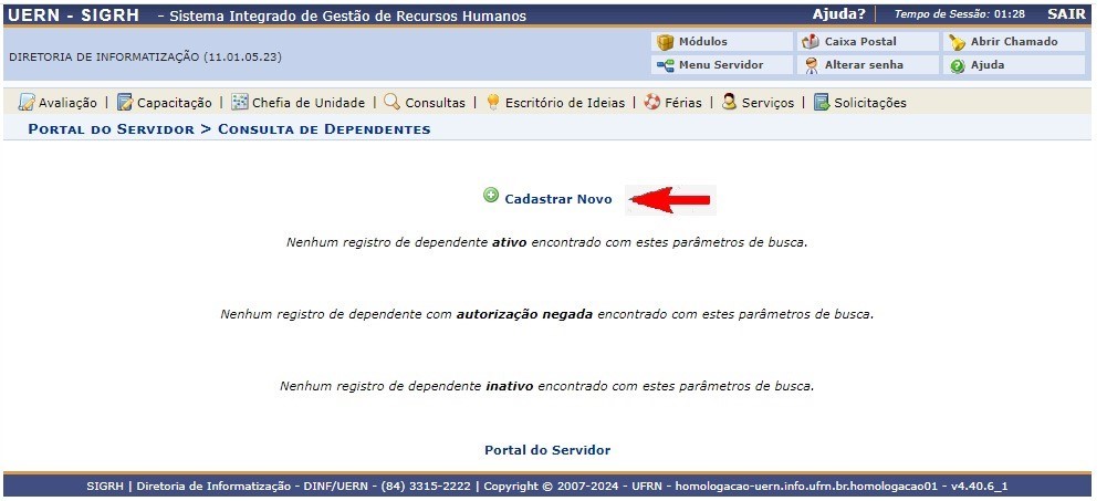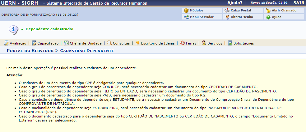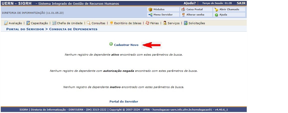 1- Clique no menu Serviços>>> Dependentes>>> Cadastrar/Consultar;