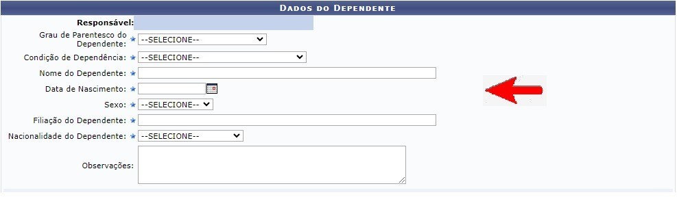 7- Preencha todos os campos obrigatórios com as informações pessoais de seu dependente;