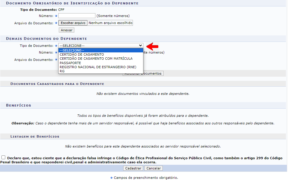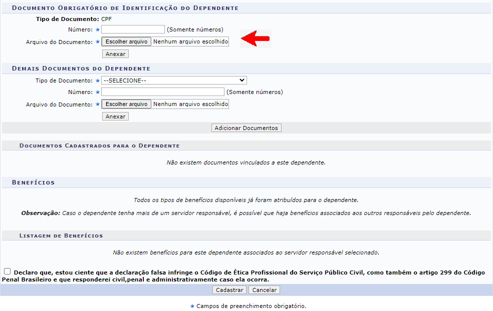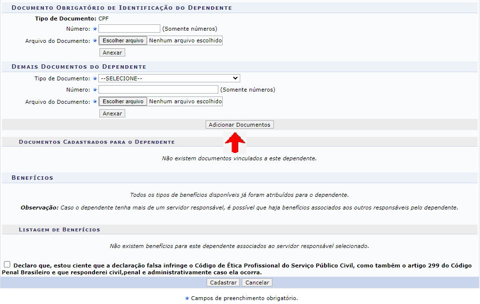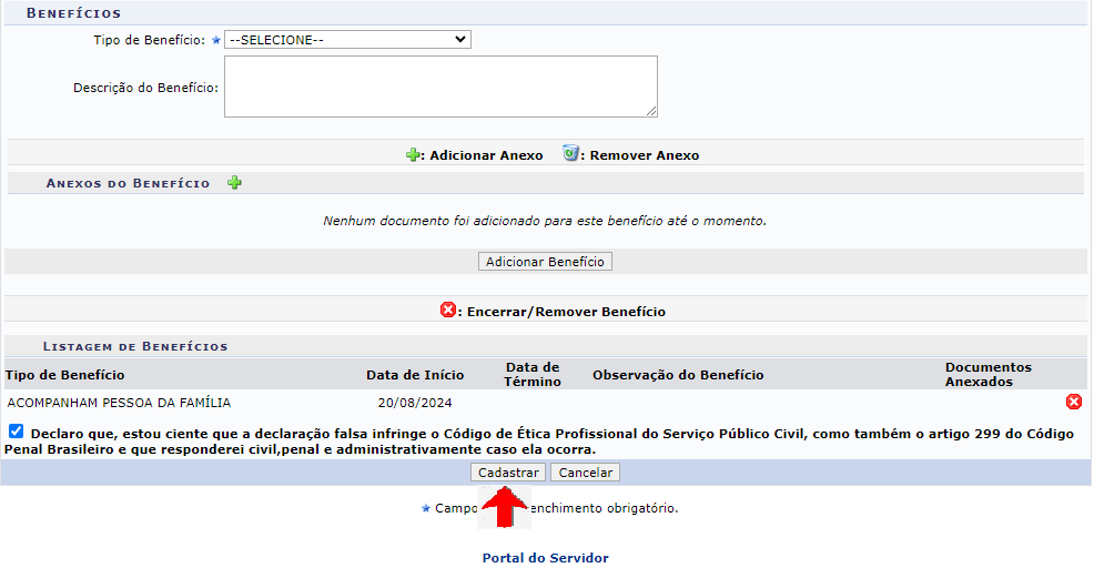 16- Clique em Cadastrar para adicionar benefícios e o dependente do servidor;