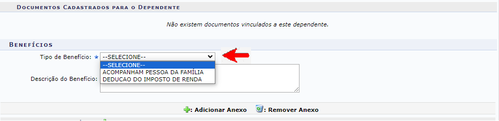 13- Selecione o tipo de benefício desejado clicando na setinha preta;