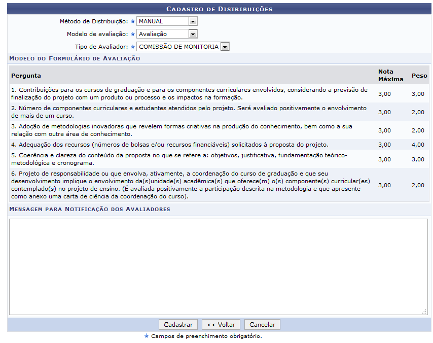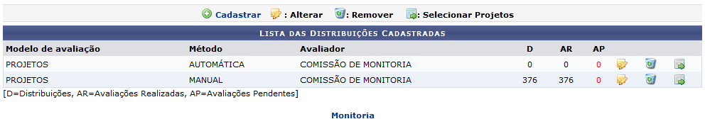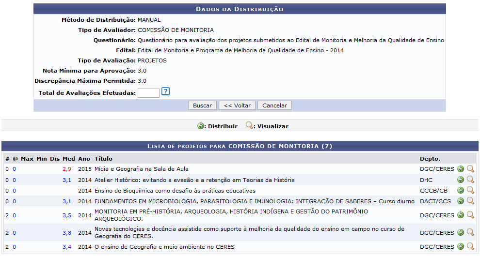 ConteúdoEsta funcionalidade permite que o usuário distribua os projetos de monitoria submetidos pelos Para realizar esta operação, acesse o SIGAA → Módulos → Monitoria → Comissões → Avaliações → A página com a Lista das Distribuições Cadastradas, será apresentada: Se desejar retornar a página principal, clique em A partir desta tela será possível Cadastrar, Alterar, Remover e/ou Selecionar Projetos de novas Cadastrar Nova Distribuição do Projeto de Monitoria Caso deseje cadastrar uma nova distribuição de projeto de monitoria, clique em Indique os seguintes itens obrigatórios: