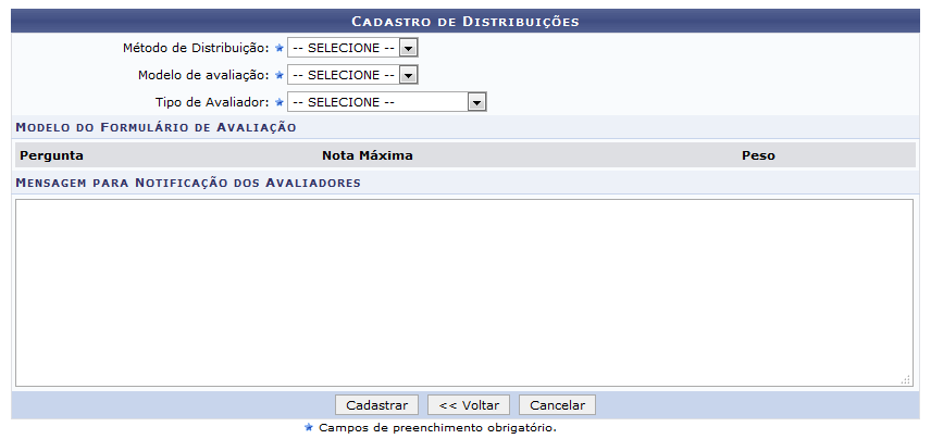Caso deseje retornar a página anterior, clique em Voltar. Esta operação será válida para todas as Se desistir da operação, clique em Cancelar e confirme a desistência na caixa de diálogo que será Ao escolher o campo Modelo de avaliação o sistema exibirá o Modelo do Formulário de Avaliação no Exemplificaremos, selecionando as seguintes opções: