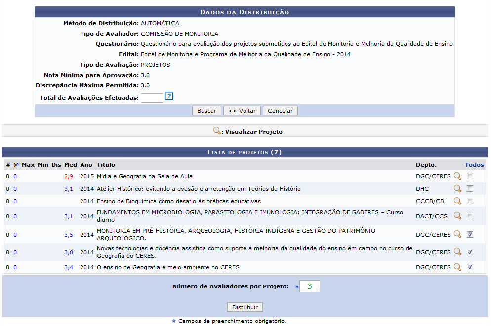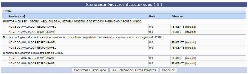 Além disso, informe o Número de Avaliadores por Projeto, ou seja, a quantidade de avaliadores para Exemplificaremos, indicando para o Número de Avaliadores por Projeto com a quantidade 3. Após Se desejar selecionar outros projetos da tela anterior, clique em Selecionar Outros Projetos. Para certificar a distribuição para os projetos, clique em Confirmar Distribuição. A mensagem de