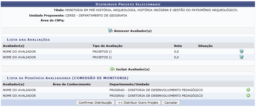 Método Manual Se selecionar o Método de avaliação Manual, a seguinte tela será exibida: O campo Total de Avaliações Efetuadas foi previamente esclarecido, neste mesmo manual. Caso deseje Visualizar um determinado projeto, clique no ícone Para Distribuir um projeto específico, clique neste símbolo Como exemplo, selecionaremos o projeto MONITORIA EM PRÉ-HISTÓRIA, ARQUEOLOGIA, HISTÓRIA Se desejar remover um determinado avaliador, clique neste símbolo Caso deseje incluir um avaliador da Lista de Possíveis Avaliadores para a Lista das Avaliações, clique no ícone Se desejar distribuir um projeto diferente do que foi, previamente selecionado, clique em Distribuir Para confirmar a distribuição do projeto escolhido, clique em Confirmar Distribuição. A mensagem