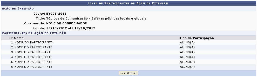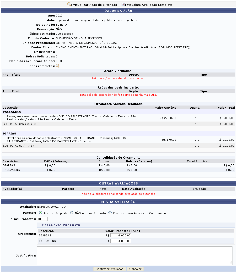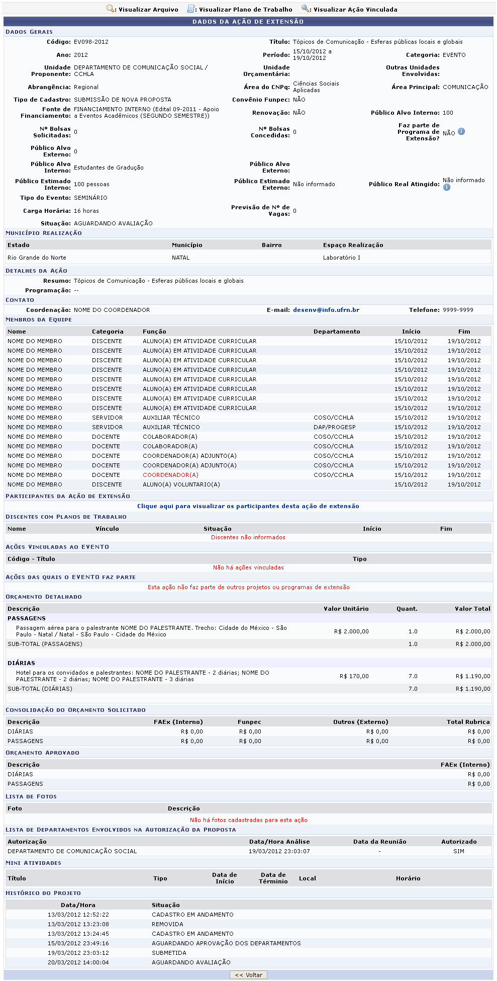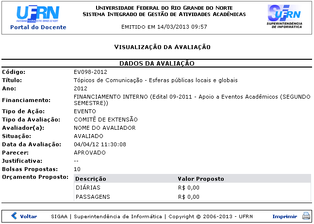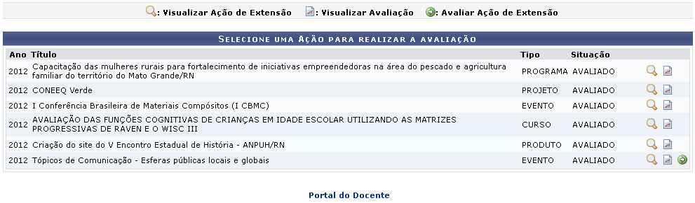 ConteúdoEsta funcionalidade permite que o membro do comitê de Extensão avalie propostas de Ações de Para realizar esta operação, acesse o SIGAA → Módulos → Portal do Docente → Extensão → Comitê de O sistema exibirá a seguinte tela: Para retornar para a página inicial do módulo, clique em As operações Visualizar Ação de Extensão, Visualizar Avaliação e Avaliar Ação de Extensão serão Visualizar Ação de Extensão Para realizar a visualização da ação de extensão, clique no ícone Caso queira retornar à tela anteriormente gerada, clique em Voltar. Esta mesma função será válida Caso a ação possua algum participante cadastrado, clique no link Visualizar Avaliação Clique no ícone Se desejar imprimir o relatório, clique no ícone