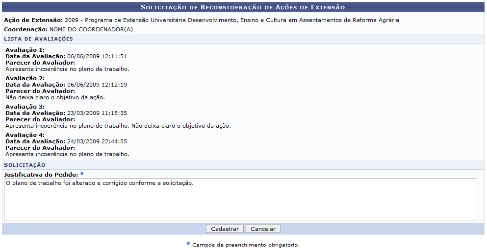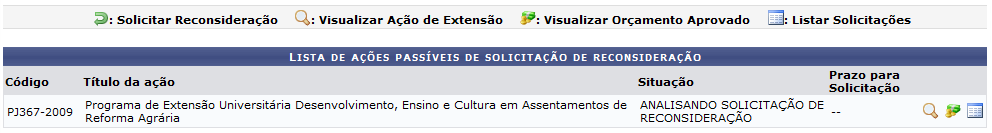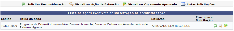 ConteúdoEsta funcionalidade permite ao usuário solicitar a reconsideração da avaliação de uma ação de Para utilizar esta funcionalidade, acesse o SIGAA → Módulos → Extensão → Gerenciar Minhas Ações → A página com a lista de ações em que o usuário é coordenador e que são passíveis de solicitação de A solicitação da reconsideração é realizada clicando no ícone Caso desista de realizar a operação, clique em Cancelar e confirme a operação na caixa de diálogo Nesta tela, o usuário deverá informar a Justificativa do Pedido de reconsideração para cadastrar a As ações de Visualizar Ação de Extensão e Visualizar Orçamento Aprovado, presentes na Lista de A opção Listar Solicitações só ficará disponível após realizar a solicitação da reconsideração. Para acessar a lista de solicitações, clique no ícone Clique em Se desejar retornar à página anterior, clique em Voltar. A visualização da reconsideração será feita clicando no ícone Se desejar imprimir o relatório, clique em Clique em Voltar, para retornar à página anterior. Para voltar ao menu principal do módulo, clique no link Bom Trabalho! | |||