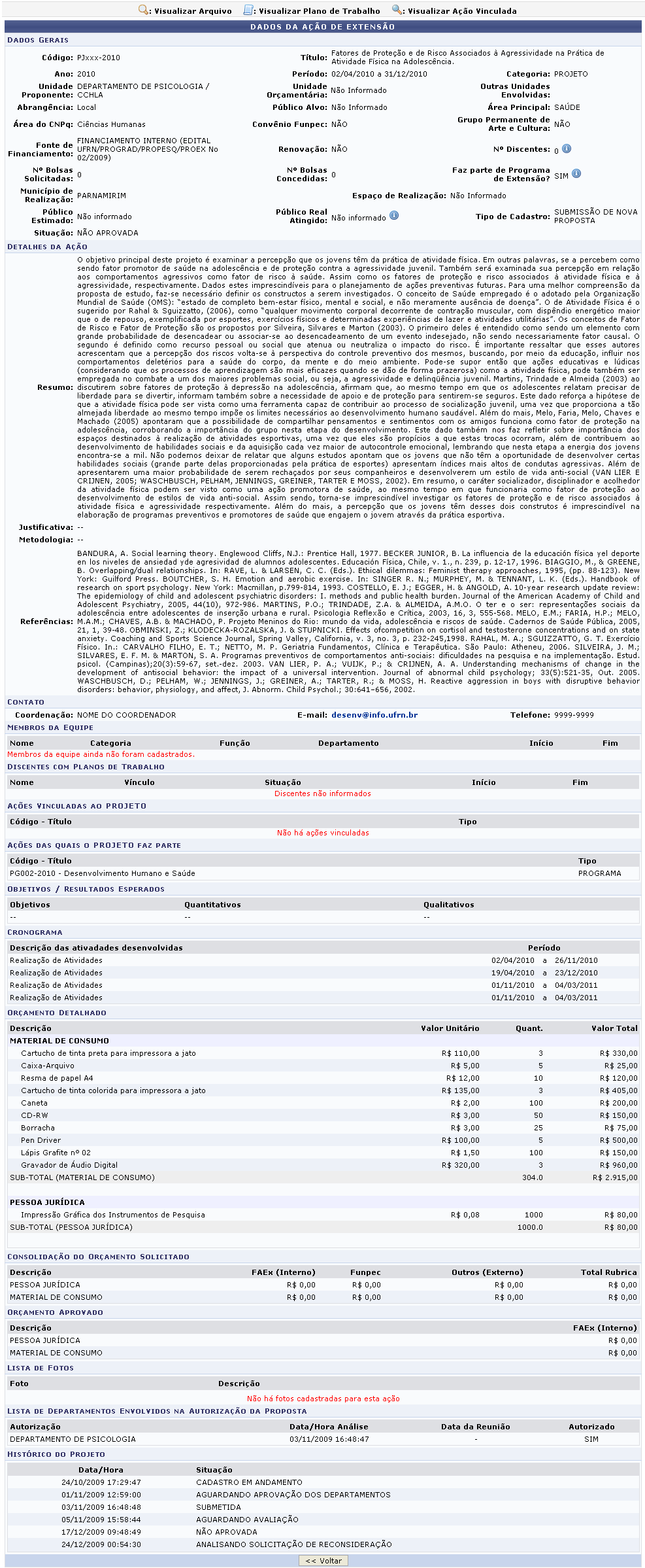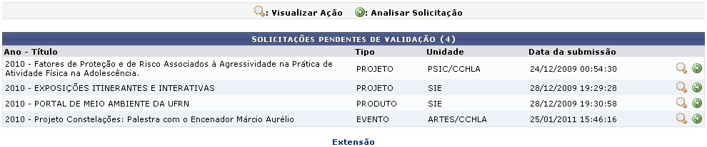 ConteúdoEsta funcionalidade permite que Gestores da Pró-Reitoria de Extensão realizem a validação de Para realizar a validação das solicitações de reconsideração, acesse o SIGAA → Módulos → Extensão → A tela a seguir contendo as Solicitações Pendentes de Validação será disponibilizada pelo sistema. Para retornar para a página inicial do módulo, clique em Nesta tela o usuário poderá visualizar o projeto da ação de extensão clicando no ícone Para retornar à tela anterior, clique em Voltar. Esta mesma função será válida sempre que estiver Ao posicionar o cursor sobre o ícone Se houver Ações Vinculadas, utilize o ícone Caso a Ação tenha Arquivos e/ou Fotos em anexo, clique no ícone O usuário poderá entrar em contato com a coordenação da ação de extensão, para isso, basta clicar Ainda na tela que permite a visualização das Solicitações Pendentes de Validação, o usuário poderá Caso desista da operação, clique em Cancelar e confirme a desistência na janela que será exibida Ao clicar no ícone Para visualizar o parecer do avaliador, clique no ícone Para retornar à tela anterior, clique em Voltar. Se desejar imprimir o relatório com o plano de trabalho, clique no ícone Para retornar para a página inicial do módulo, clique em Retornando a tela que permite Analisar Solicitação de Reconsideração, o usuário deverá informar a Bom Trabalho! | |||