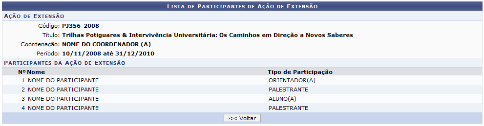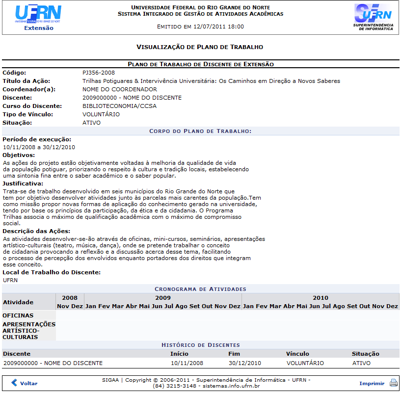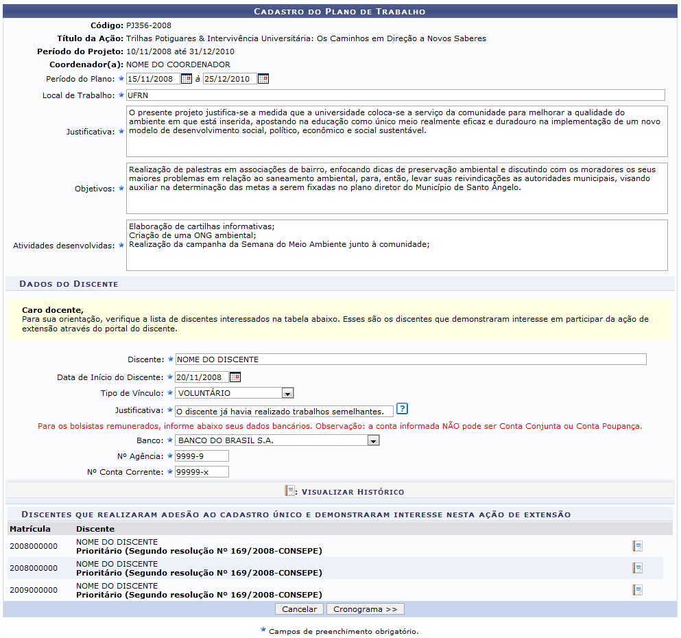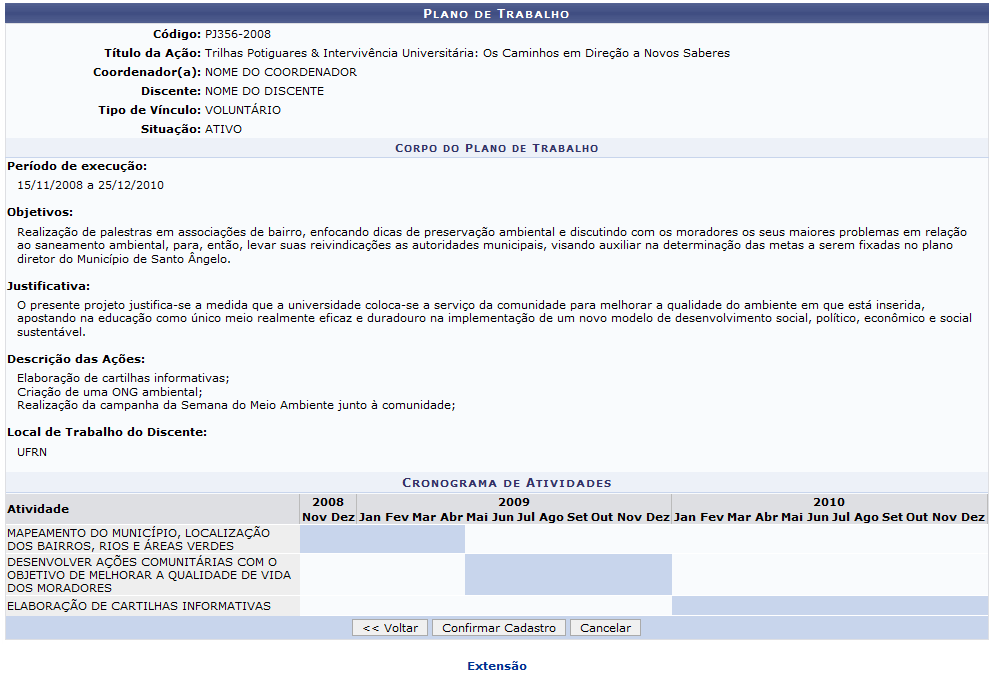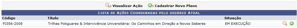 ConteúdoNesta operação é possível cadastrar um plano de trabalho e associá-lo a um discente (Bolsista de Para isso, acesse o SIGAA → Módulos → Extensão → Gerenciar Minhas Ações → Planos de Trabalho → A tela com a lista de ações coordenadas pelo o usuário atual será exibida: Para visualizar a ação, clique no ícone Clique em Voltar para retornar à tela anterior. Esta ação será válida para todas as tela que a Na aba Participantes da Ação de Extensão, utilize o link Se desejar visualizar plano de trabalho do discente, clique no ícone Caso haja arquivos inseridos na ação, clique no ícone Se houver ações vinculadas, clique no ícone De volta a lista de ações, clique no ícone Caso desista de realizar a operação, clique em Cancelar e confirme a operação na caixa de diálogo Se desejar visualizar o histórico do discente, clique no ícone Clique em OK para confirmar a operação. O arquivo será exibido em formato de PDF. Na tela de cadastro, o usuário deverá informar os seguintes critérios: