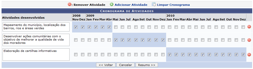 Para os bolsistas remunerados, informe os dados bancários, Banco, Nº Agência e Nº Conta Corrente. Após informar os dados, clique em Cronograma para dar continuidade a operação. A tela a seguir Se desejar retornar à página anterior, clique em Voltar. Esta operação é válida para todas as telas O usuário preencherá o cronograma de atividades do projeto. Para tanto, deverá digitar o nome da Caso o usuário deseje remover alguma atividade, clique no ícone Clique no link Uma vez inseridas todas as atividades do cronograma, o usuário deverá clicar em Resumo para Clique no link A finalização dessa operação é efetuada clicando em Confirmar Cadastro. A mensagem de sucesso Bom Trabalho! | |||